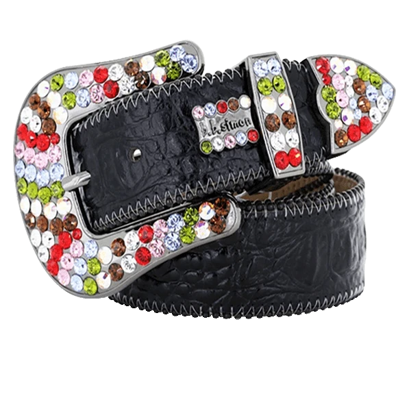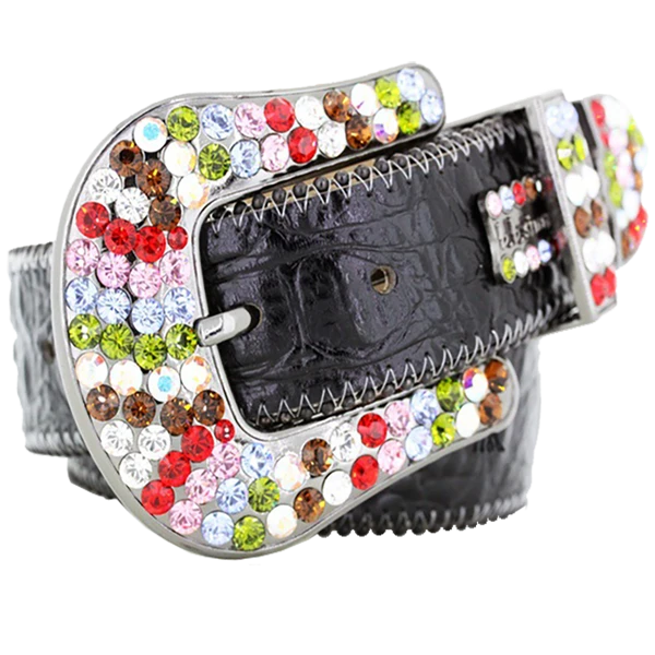 All our belts are made with beautiful Swarovski crystals this one happens to be on the buckle a black Italian leather strap.