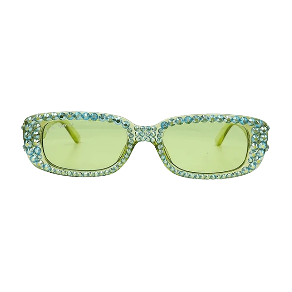 Inspired by our love for dramatic retro silhouettes, these transparent green sunglasses are adorned with Swarovski crystals.