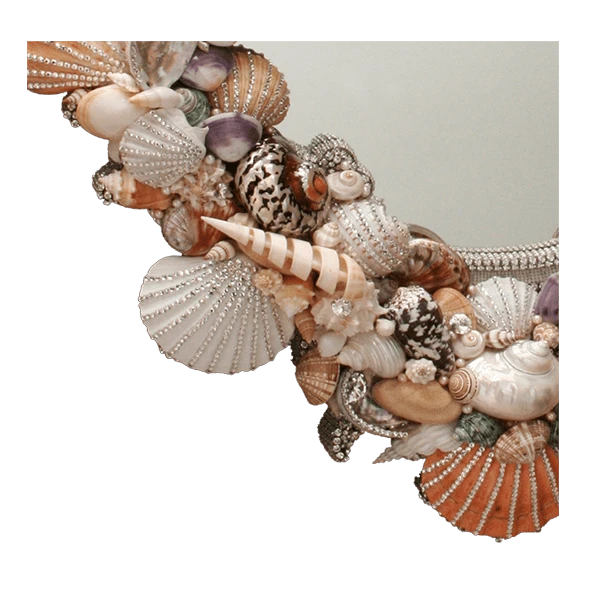 Bring the soothing view of the seashore to your home or office with this b.b.simon coastal inspired mirror. This one of a kind heirloom is handcrafted in the USA by the most specialized artisans of California using dazzling seashells and sparkling little Clear Swarovski crystals which add an elegant touch to the pattern of this unique decorative jeweled mirror.
