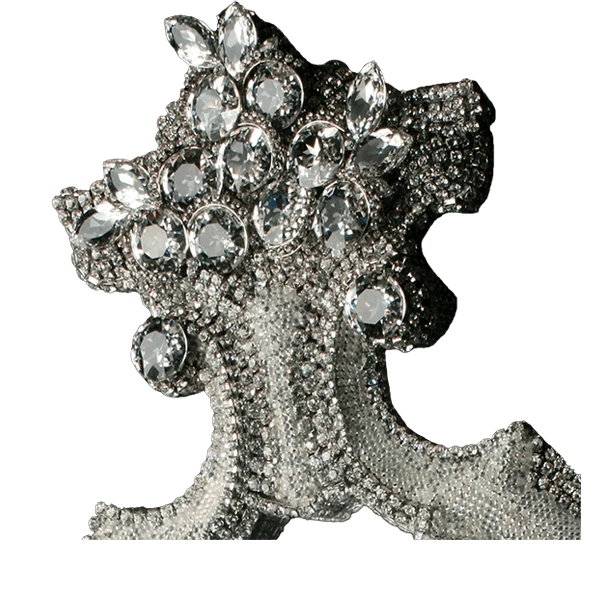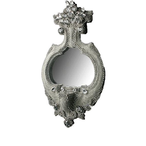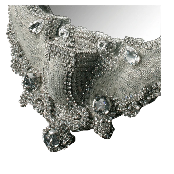 This unique and stunning jeweled wall mirror is designed with sparkling little Clear Swarovski crystals. The M-206 is handcrafted in the USA by the most specialized artificers of California. The splendid shape of this delicate jeweled mirror makes it have a unique decorative design. It may be the perfect gift for someone special.