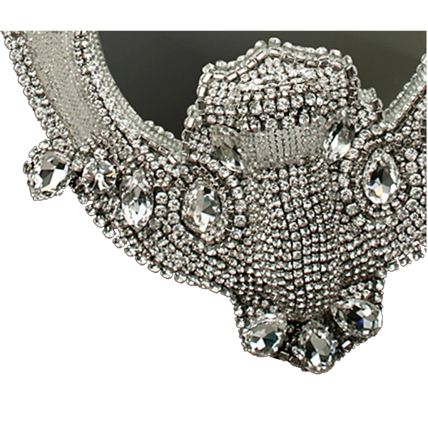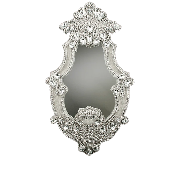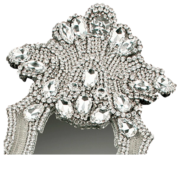 This unique and stunning jeweled wall mirror is designed with sparkling little Clear Swarovski crystals. The M-204 is handcrafted in the USA by the most specialized artificers of California. The splendid shape of this delicate jeweled mirror makes it have a unique decorative design. It may be the perfect gift for someone special.