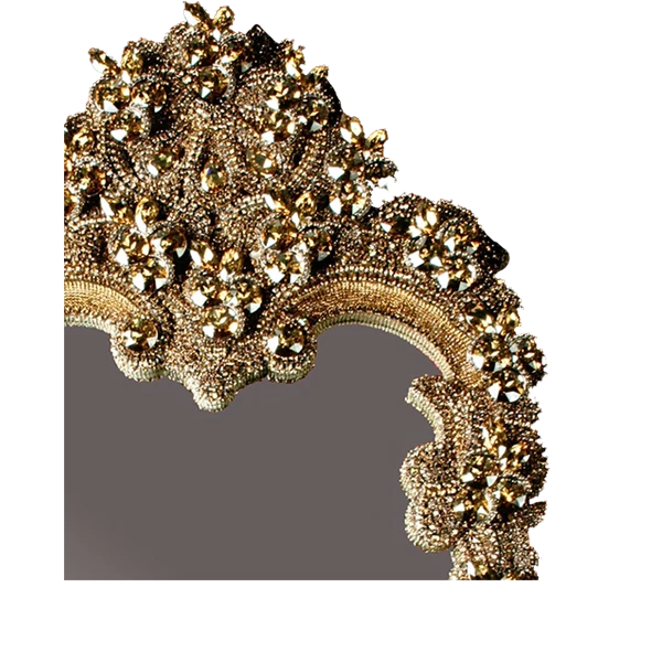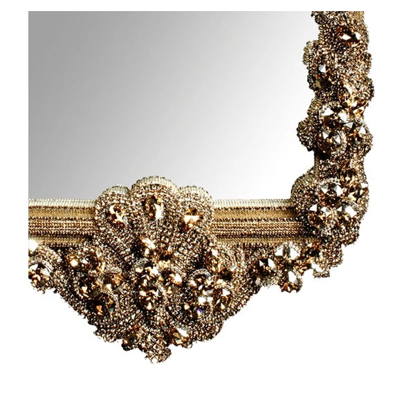 This unique and stunning b.b.simon jeweled wall mirror is adorned with countless sparkling little Light Colorado(Gold) Swarovski crystals. The splendid shape of this delicate jeweled mirror makes it have a unique decorative design. The M-306 is handcrafted in the USA by the most specialized artificers of California and will add sparkle to your home or office.