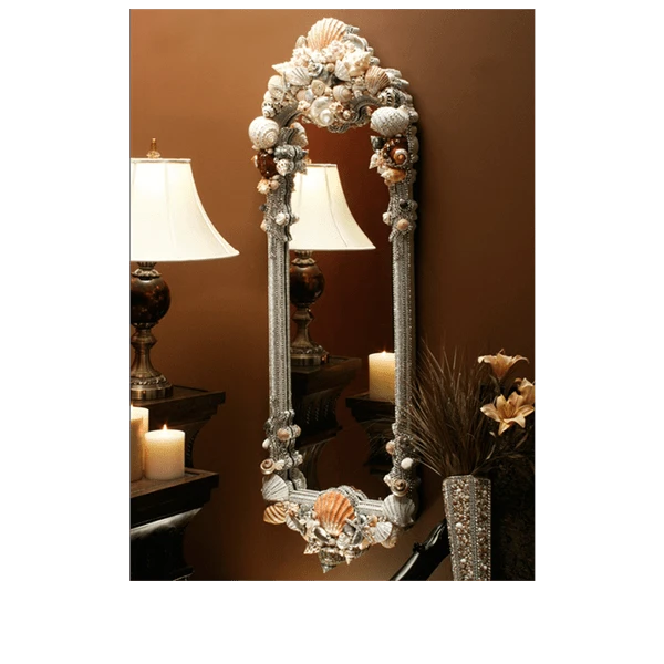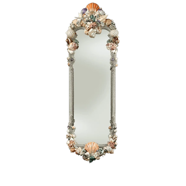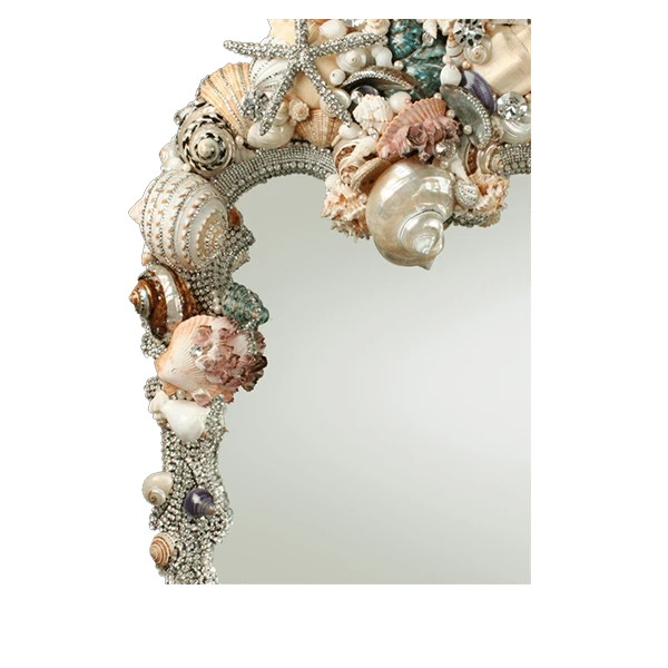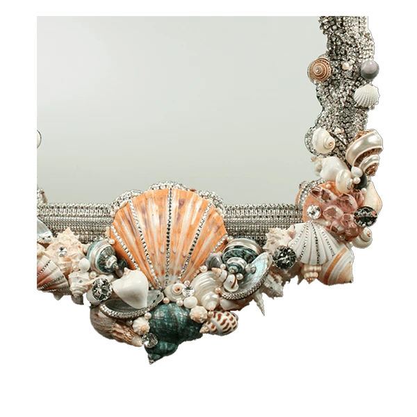 Bring the soothing glow of the seashore to your home or office with this b.b.simon coastal inspired mirror. This one of a kind heirloom is handcrafted in the USA by the most specialized artificers of California using dazzling seashells and sparkling little Clear Swarovski crystals which add an elegant touch to the pattern of this unique decorative jeweled mirror.