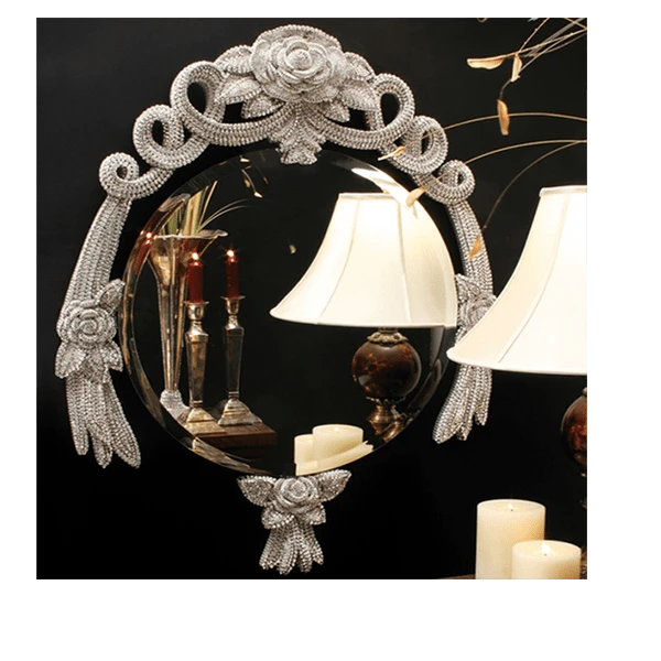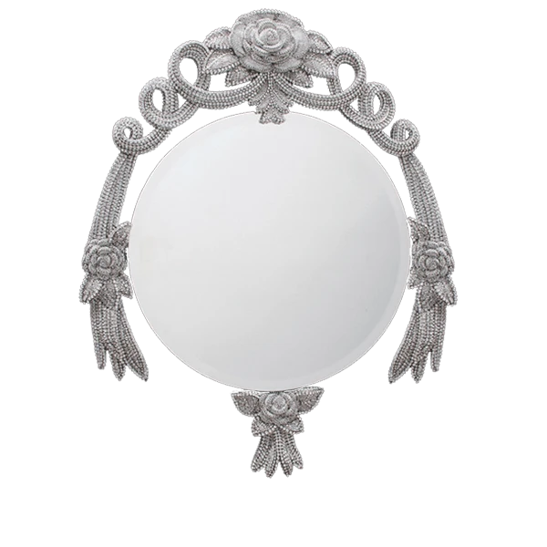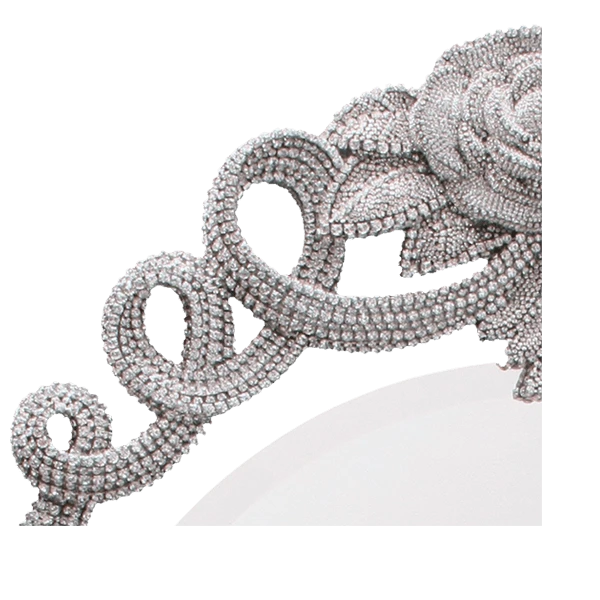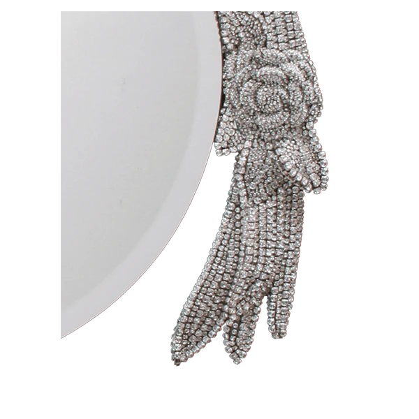 This unique round-shaped wall mirror is handcrafted in the USA. This one of a kind heirloom is adorned with sparkling Clear Swarovski crystals. It will delightfully add sparkle to your home or office. Gift your family, friends or even yourself, with this one-of-a-kind decorative jeweled mirror.