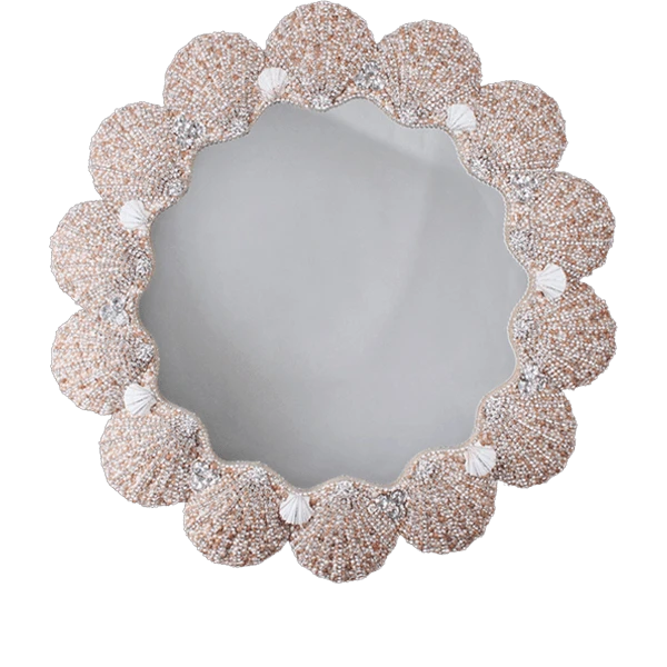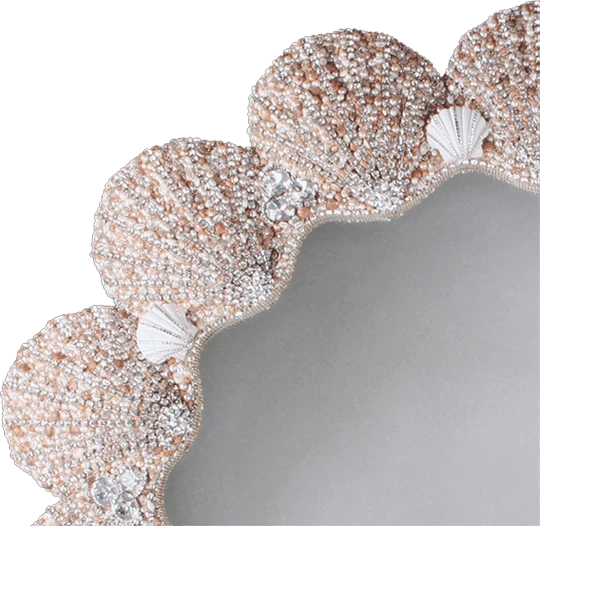 This fabulous round-shaped seashell wall mirror will bring the soothing glow of the seashore to your home or office. This one of a kind heirloom is handcrafted in the USA by the most specialized artificers of California using dazzling seashells and sparkling little Clear Swarovski crystals which add an elegant touch to the pattern of this unique decorative jeweled mirror.