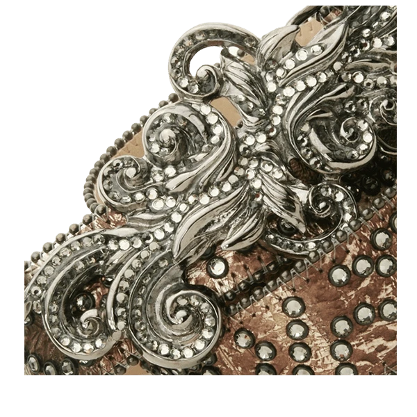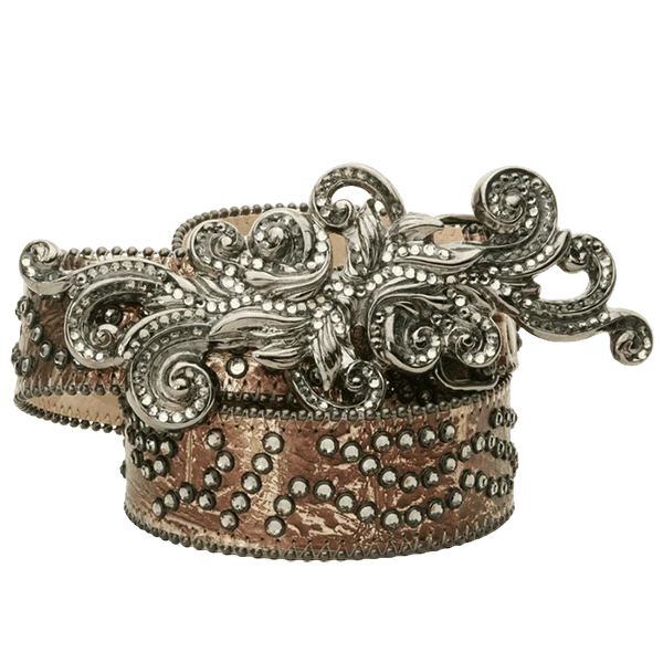 The swirly fashion belt is a custom design that is adorned with Black Diamond Swarovski crystals.