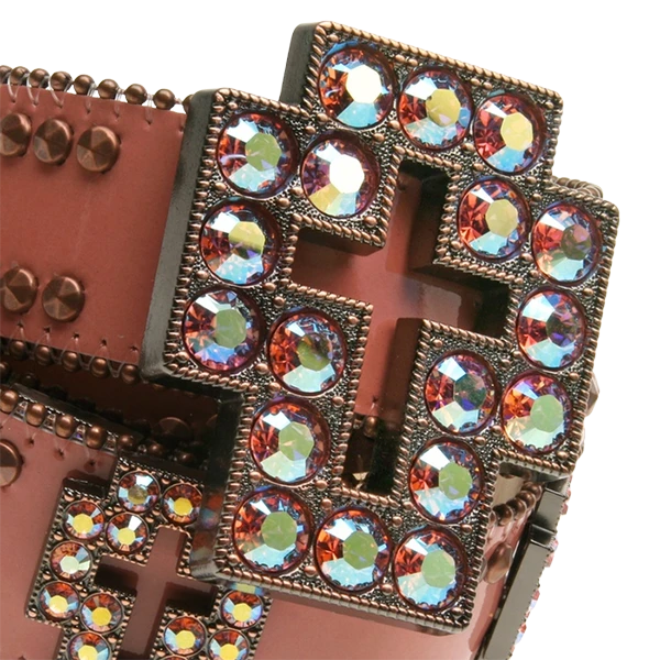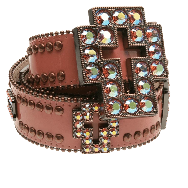 Two rows of copper finish spike studs adorn the strap, separating the cross ornaments.
