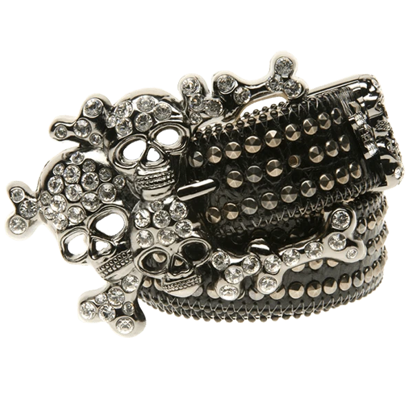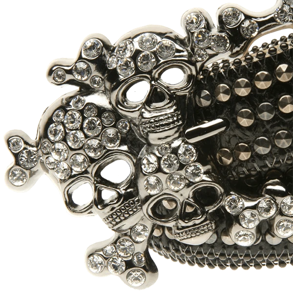 It features a buckle made of stacked gun metal finish skull & crossbones combined with glimmering diamond-like Swarovski crystals.